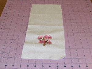 Step 15: Put a light crease in the fabric to find the center. Hoop half of the fabric with tear away stabilizer.