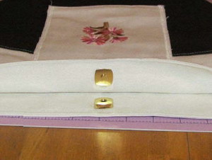 Step 22: On the inside of the bag, find the center top of the bag and mark it with a pen. I went down about 1 inch. Once you mark it, cut two small slits in the fabric. Do not go through to the outside fabric. Push the snap through the holes.